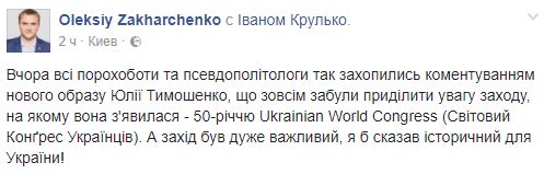 "Вчера все порохоботы и псевдополитологи так увлеклись комментированием нового образа Юлии Тимошенко, что совсем забыли уделить внимание мероприятию, на котором она появилась - 50-летию Ukrainian World Congress (Всемирного Конгресса Украинцев). А мероприятие было очень важеным, я бы сказал историческим для Украины!", - написал Захарченко в Facebook.