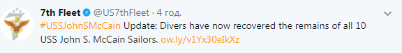 Водолазы нашли тела всех погибших моряков с эсминца "John S. McCain"