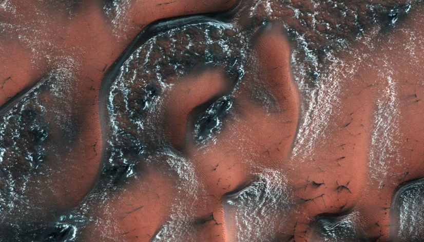 Рельеф, похожий на земные дюны, появляется вследствие того, что в северном полушарии Марса в период аналогичный нашей весне, начинают раскалываться льды, а пески, скрытые под ними, выходят на поверхность.