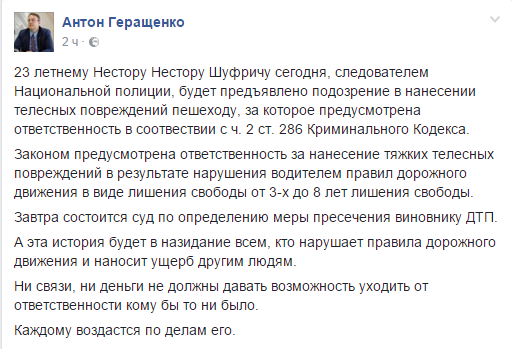 "Завтра состоится суд по определению меры пресечения виновнику ДТП (Шуфричу - младшему - ред.)", - написал Геращенко.