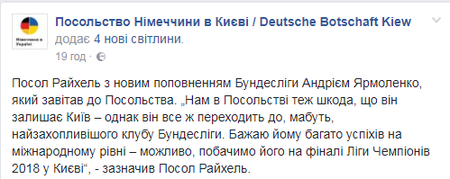 "Нам в посольстве тоже жаль, что он покидает Киев - однако он все же переходит, пожалуй, в самый захватывающий клуб Бундеслиги. Желаю Андрею много успехов на международном уровне. Возможно, увидим его в финале Лиги Чемпионов 2018 в Киеве ", - отметил посол Райхель.