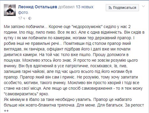 "Он был одет во все патриотическое, улыбался, ел, пил, оставил хорошие чаевые, но во время этого всего под его ногами был флаг. Флаг, который он сам и принес. Возможно, он просто больной и тогда все станет на свои места", - уточнил Остальцев.