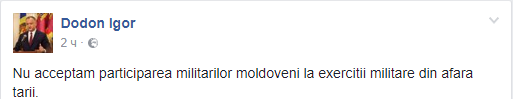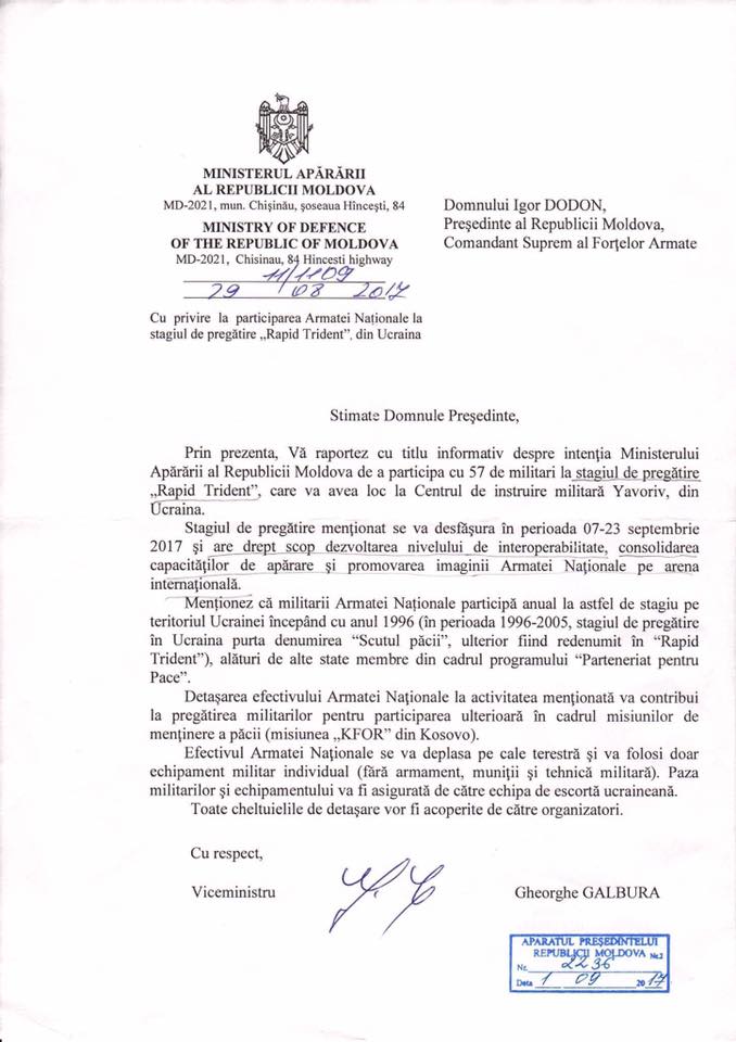 Додон опубликовал свое письмо в ответ замминистру обороны Георге Галбурой, который в конце августа сообщил президенту об участии 57 военных в учениях Rapid Trident, которые пройдут на Яворовском полигоне во Львовской области, для подготовки к миротворческой миссии в Косово.