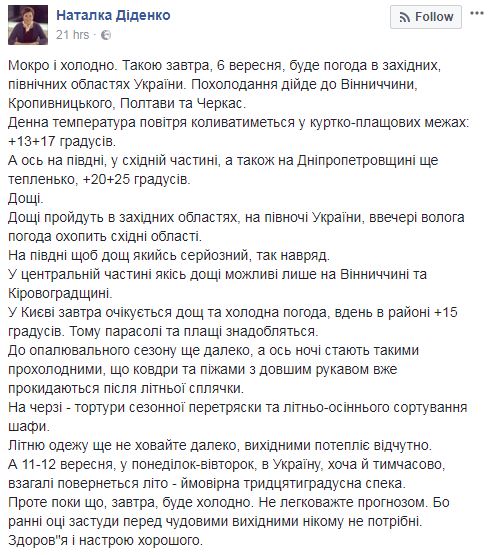 Об этом сообщила синоптик Наталья Диденко на своей странице в Facebook.