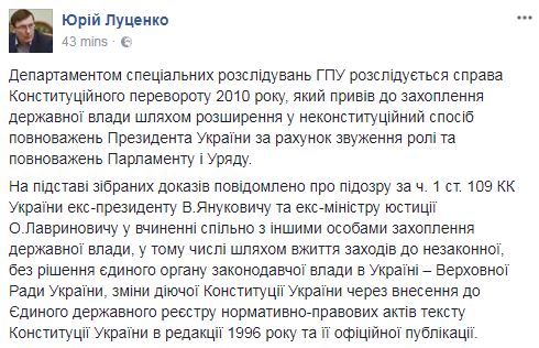 Генеральная прокуратура сообщила о подозрении бывшему президенту Виктору Януковичу и бывшему министру юстиции Александру Лавриновичу в захвате власти при помощи незаконного возврата Конституции 1996 года в 2010 году. Об этом сообщил генеральный прокурор Юрий Луценко на своей странице в Facebook.