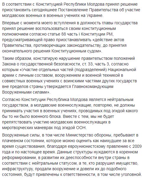 "Впервые с момента моего вступления в должность главы государства принял решение воспользоваться своим конституционным полномочием согласно статье 88 часть i Конституции РМ, предусматривающей право приостанавливать "действие актов Правительства, противоречащих законодательству, до принятия окончательного решения Конституционным судом", – написал он.