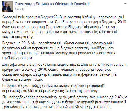 "Сегодня внес проект бюджета на рассмотрение Кабмина - своевременно, как и предусмотрено законодательством. До 15 сентября проект госбюджета-2018 будет представлен на рассмотрение парламента. Бюджет "под елочку" - это уже прошлое", - отметил Данилюк.
