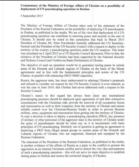 Дипломаты разместили фотокопию заявления Министерства иностранных дел Украины от 5 сентября, в которой украинское внешнеполитическое ведомство отреагировало на заявление руководства РФ о возможности размещения миротворцев ООН на Донбассе.