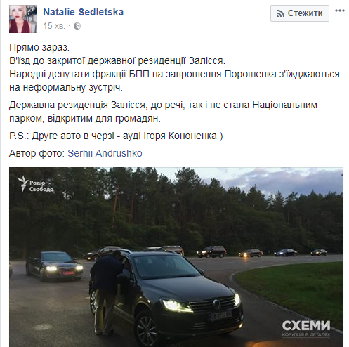 "Прямо сейчас. Въезд на закрытую государственную резиденции Залесье. Народные депутаты фракции БПП по приглашению Порошенко съезжаются на неформальную встречу. Государственная резиденция Залесье, кстати, так и не стала Национальным парком, открытым для граждан.