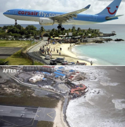 Ураган "Ирма" разрушил аэропорт Принцессы Юлианы на острове Сен-Мартен в Карибском море (заморская территория Нидерландов), известный тем, что вплотную прилегает к пляжу.