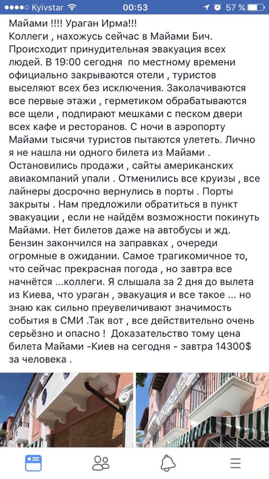 Очевидцы сообщают, что в Майями-Бич закрываются отели и магазины. Происходит эвакуация населения, на заправках нет бензина. А с ночи в аэропорту Майями пытаются улететь тысячи туристов и цены на билеты до Киева, в частности, достигли пиковых высот - $14300 за одного человека.