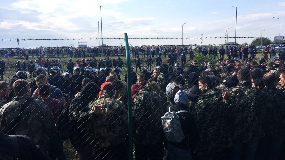 На украинской стороне границы - первая стычка. Около 50 активистов палаточного городка едва не вступили в драку с людьми, которых они считают "титушками". Полиция взяла последних в полукольцо, оттеснила к забору и не дает ситуации перерасти в столкновение. Люди кричат титушкам - "Вы предатели, зачем вы сюда приехали?"