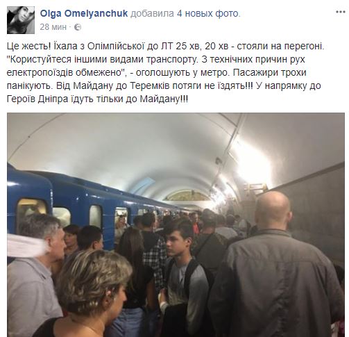 20:03 "Это жесть! Ехала с Олимпийской к Льва Толстого 25 мин, 20 мин - стояли на перегоне. "Пользуйтесь другими видами транспорта. По техническим причинам движение электропоездов ограничено", - объявляют в метро. Пассажиры немного паникуют. От Майдана до Теремков поезда не ездят !!! По направлению к Героев Днепра едут только до Майдана !!!", - пишет в Facebook журналистка Ольга Омельянчук.