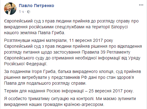 "Европейский суд по правам человека принял к рассмотрению дело о похищении российскими спецслужбами на территории Беларуси нашего земляка Павла Гриба", - написал Петренко.