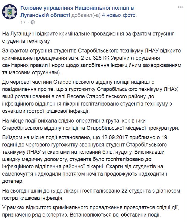 По факту отравления студентов Старобельского техникума ЛНАУ открыто уголовное производство по ч. 2 ст. 325 УК Украины (нарушение санитарных правил и норм относительно предотвращения инфекционных заболеваний и массовых отравлений).
