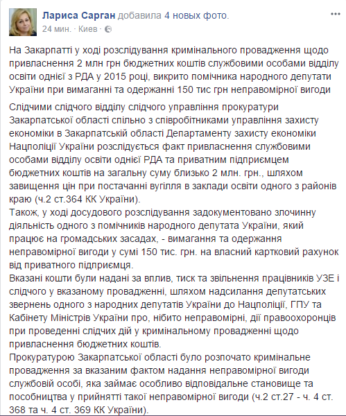 "В ходе досудебного расследования задокументирована преступная деятельность одного из помощников народного депутата Украины, который работает на общественных началах ... Указанные средства были предоставлены за влияние, давление и увольнения следователя в указанном производстве, путем направления депутатских обращений одного из народных депутатов Украины в Нацполицию, ГПУ и Кабинет министров Украины о якобы неправомерных, действия правоохранителей при проведении следственных действий ... ", - написала Сарган.