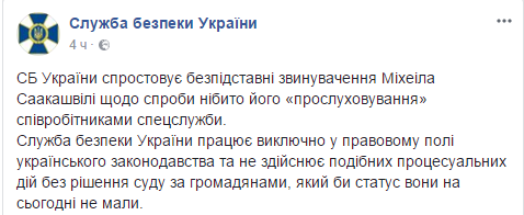 "СБ Украины опровергает безосновательные обвинения Саакашвили о попытке якобы его "прослушивания" сотрудниками спецслужбы", - сказано в нем.