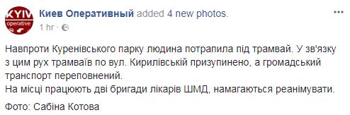 Напротив Куреневского парка в Киеве женщина попала под трамвай. Об этом на своей странице в Facebook сообщает портал "Киев оперативный".