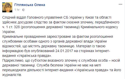 "Уголовное производство зарегистрировано по факту разглашения должностными лицами одного из органов государственной власти Украины сведений, содержащих государственную тайну. Материал с такой информацией был опубликован 24.01.2017 на страницах Интернет-издания "Украинская правда"", - написала она на своей странице в Facebook.