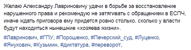 Желаю Александру Лавриновичу удачи в борьбе за восстановление нарушенного права и рекомендую не затягивать с обращением в ЕСПЧ, иначе ждать приговора ему придется ровно столько, сколько у власти будут находиться нынешние "хозяева жизни", - резюмировал бывший заместитель генерального прокурора Украины.
