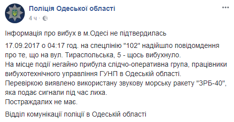 Полицейские отметили, что около 4 утра 17 сентября поступило сообщение, что на ул. Тираспольская, 5 - что-то взорвалось.