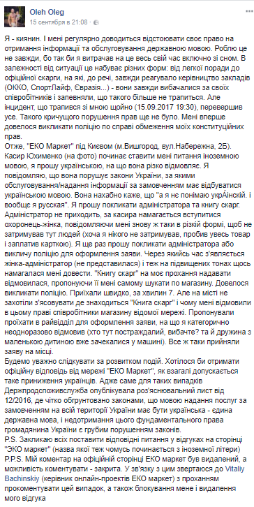 "Кассир начала задавать мне вопросы на иностранном языке, я попросил говорить на украинском, на что она ответила отказом. Я сообщаю, что она нарушает законы Украины, по которому обслуживание по умолчанию должно происходить на украинском языке. Она нагло говорит: "я не понимаю украинский. И вообще я русская", - описывает ситуацию покупатель.
