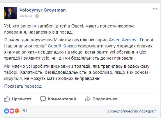 Он также призвал всех сделать выводы из трагедии, которая произошла в одесском лагере.