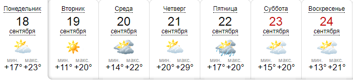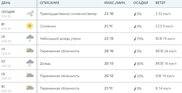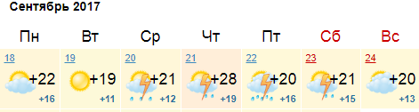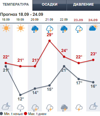 Сайт Weather.com увидел дождь в среду и пятницу. В понедельник сильный ветер. Днем температура +20...+23. В четверг до +28.