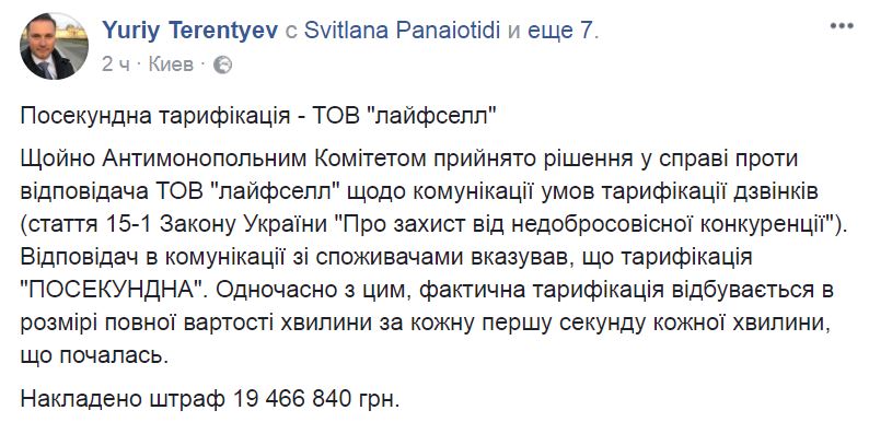Антимонопольный комитет оштрафовал оператора мобильной связи ООО "Лайфселл" на 19 млн 466,84 тыс. грн за посекундную тарификацию звонков. Об этом сообщил глава АМКУ Юрий Терентьев на своей странице в Facebook.