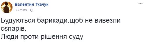 "Строятся баррикади, чтобы не вывезли сепаров. Люди против решения суда", - пишет на своей странице в Facebook активист Валентин Ткачук.