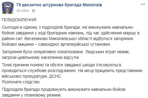 "Сегодня в одном из подразделений бригады, которые выполняли учебно-боевые задачи в ходе бригадных учений, во время марша в районе пгт. Веселиново Николаевской области произошло возгорание боевой машины – самоходной артиллерийской установки", – говорится в сообщении.