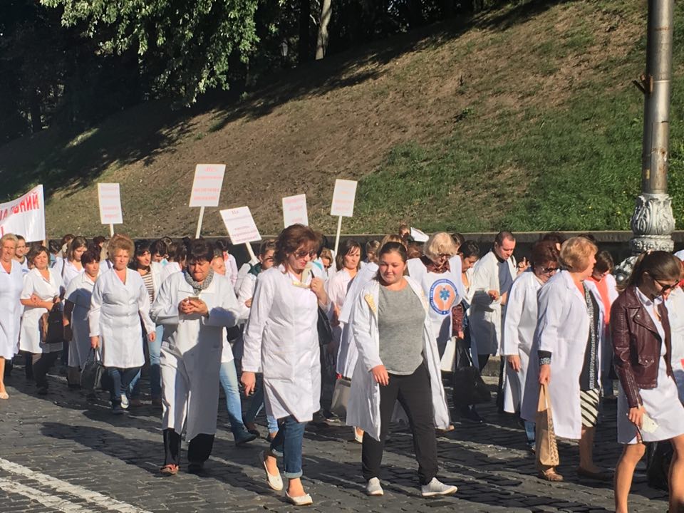 10:24 Пока что в президентском квартале митингуют несколько тысяч врачей. Медики выступают против реформ Супрун, которые подразумевают сокращение больниц и врачей, а также введение официальной платы за лечение.