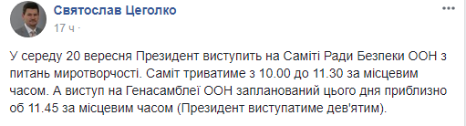 "В среду 20 сентября Президент выступит на саммите Совета безопасности ООН по вопросам миротворчества. Саммит пройдет с 10:00 до 11:30 по местному времени. А выступление на Генассамблее ООН запланировано в этот же день примерно в 11:45 по местному времени (Президент выступит девятым)", - написал Цеголко.