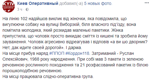 Полиция Киева задержала мужчину, который разбрасывал пакетики, предположительно с наркотиками, у подъезда дома по улице Выборгской в Соломенском районе. Об этом в Facebook сообщает "Киев Оперативный".