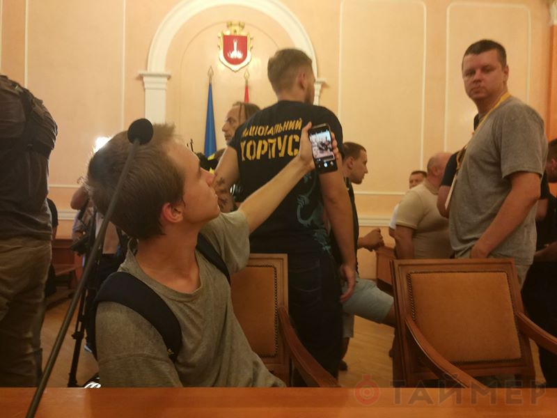В настоящее время активисты ходят по зданию в ожидании мэра Одессы Геннадия Труханова. Большая часть из них собрались в сессионном зале, где фотографируются у трибуны и в кресле мэра.