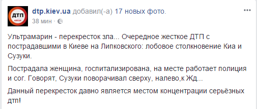 "В Киеве на улице Липковского (бывшая Урицкого): лобовое столкновение Kia и Suzuki. Пострадала женщина, госпитализирована, на месте работает полиция и СОГ. Говорят, Suzuki поворачивал сверху, налево, к ЖД", - говориться в сообщении.