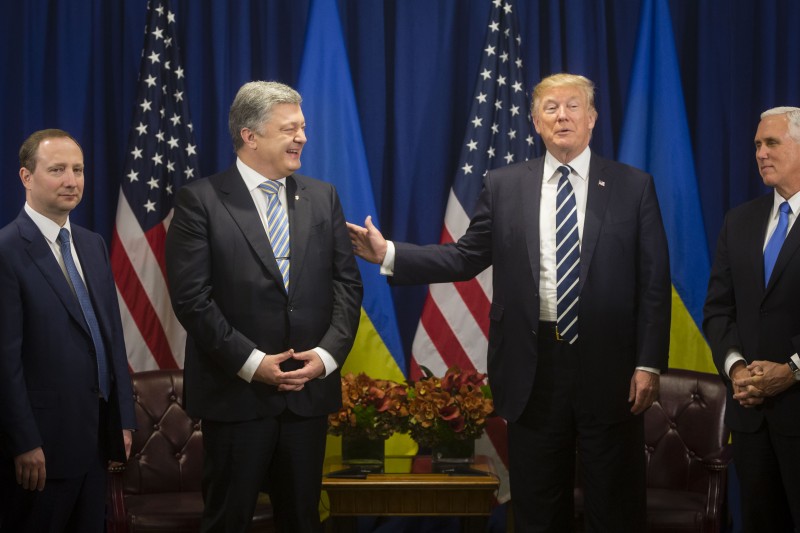 "Президент Дональд Трамп встретился с президентом Украины Петром Порошенко. Президент Трамп приветствовал реформы в Украине, которые способствовали экономическому росту страны и ее обороноспособности, и призвал президента Порошенко продолжить работу по ликвидации коррупции и улучшению делового климата своей страны. Президент Трамп подтвердил американскую поддержку суверенитета и территориальной целостности Украины. Президент Трамп и президент Порошенко обсудили пути достижения мира на востоке Украины".
