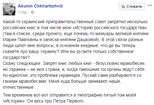 Реакция писателя и историка не заставила себя ждать, Борис Акунин высказал свое мнение в Facebook.