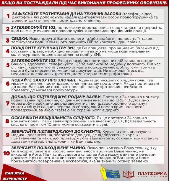 "Памятка журналисту! Что делать, если вы пострадали при исполнении профессиональных обязанностей. Рекомендации разработаны в партнерстве НСЖУ и ОО "Платформа прав человека", - пояснил Сергей Томиленко.