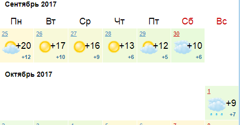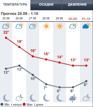 Сайт Sinoptik.ua дает похожий прогноз. В понедельник еще обещают +20. Во вторник-среду +15...+17 днем. С четверга днем термометры покажут +11...+12. При этом с 26 по 28 сентября включительно будет ясная погода. В воскресенье обещают дождь.