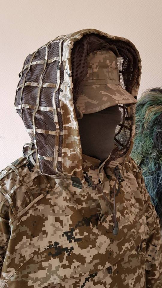 Манжеты рукавов продлены - они скрывают почти всю ладонь. Маскировочная сетка капюшона защищает от паразитов и маскирует снайпера и основную часть оружия. В брюках предусмотрены отверстия для быстрого доступа к подкостюмному пространству. Наличие эластичных шнуров и фиксаторов позволяют подогнать костюм под себя.
