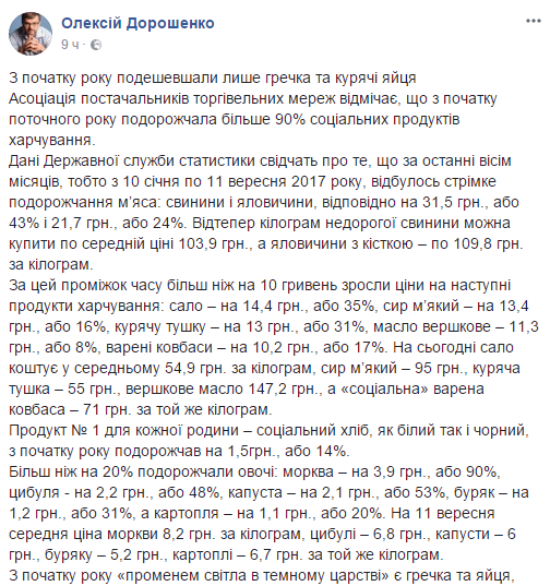 С начала текущего года подорожали более 90% продуктов питания. Об этом сообщил председатель Ассоциация поставщиков торговых сетей Алексей Дорошенко на своей странице в социальной сети Facebook.