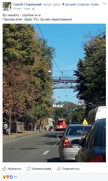 15:25  "Все ждут - прыгнет или нет. Парковая аллея. Сейчас. Движение под ней парализовано", - написал в Facebook пользователь Сергей Старенький.
