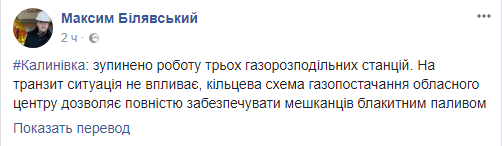 "Калиновка: остановлена работа трех газораспределительных станций. На транзит ситуация не влияет, кольцевая схема газоснабжения областного центра позволяет полностью обеспечивать жителей голубым топливом", – написал он.