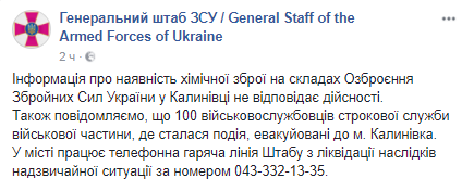 "Информация о наличии химического оружия на складах вооружения Вооруженных Сил Украины в Калиновке не соответствует действительности", - сообщает Генштаб.