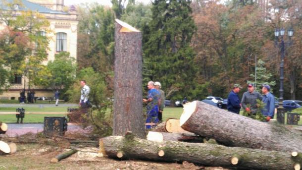 В Киеве сегодня в парке возле политеха спилили 100-летнюю ель. Теперь на ее месте – лишь бревна и пень.