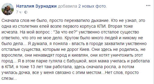 В комментариях к сообщению Наталии киевляне возмущаются: эти деревья для них – символ старого Киева.