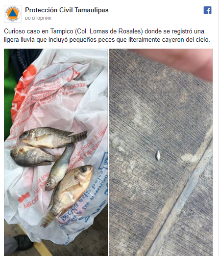 На северо-востоке Мексики неожиданно прошел дождь из рыбы. С неба вместе с дождевыми каплями на головы мексиканцев сыпались рыбины. Об этом сообщают РИА Новости со ссылкой на Управление гражданской обороны штата Тамаулипас.