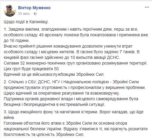 "Совместно с СБУ, ГСЧС, НГУ и Национальной полицией – Вооруженные Силы продемонстрировали сплоченность и профессионализм в решении проблемы", - подчеркнул Муженко.