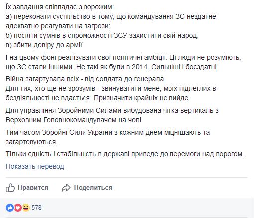 Их задача совпадает с вражеской: а) убедить общество в том, что командование ВС не способно адекватно реагировать на угрозы; б) посеять сомнение в способности ВСУ защитить свой народ, в) пошатнуть доверие к армии. И на этом фоне реализовать свои политические амбиции. Эти люди не понимают, что ВС стали другими. Не такие, как были в 2014 ", - написал Муженко.